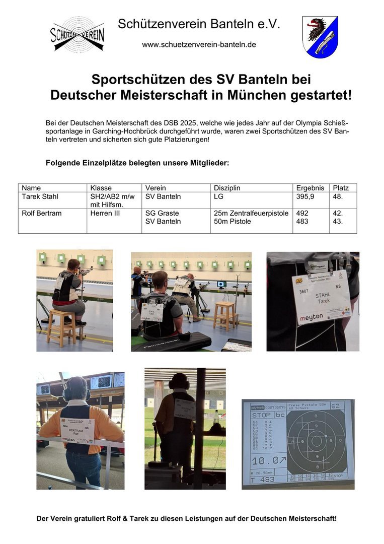 Bei der Landesmeisterschaft des NSSV 2025, welche wie jedes Jahr auf der Wilkenburg in Hannover durchgeführt wurden, waren die Sportschützen des SV Banteln vertreten und sicherten sich vordere Plätze!