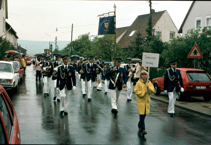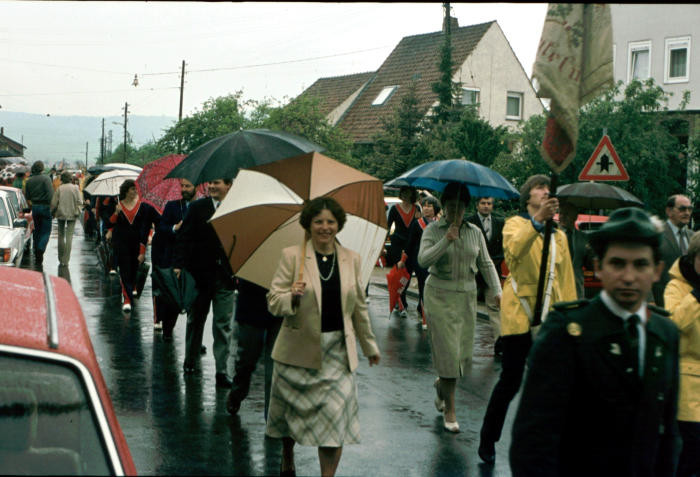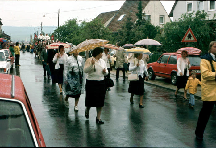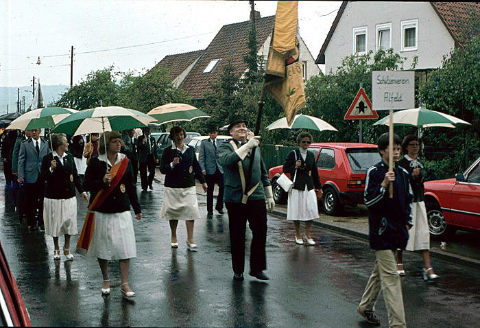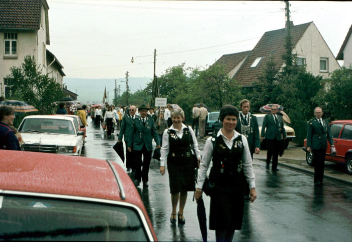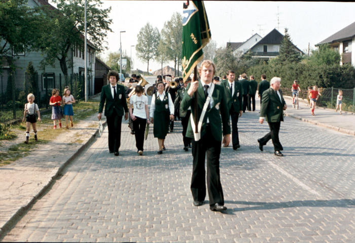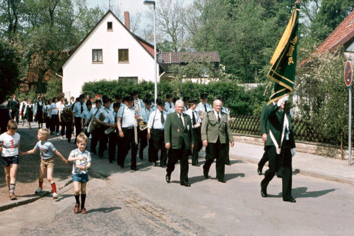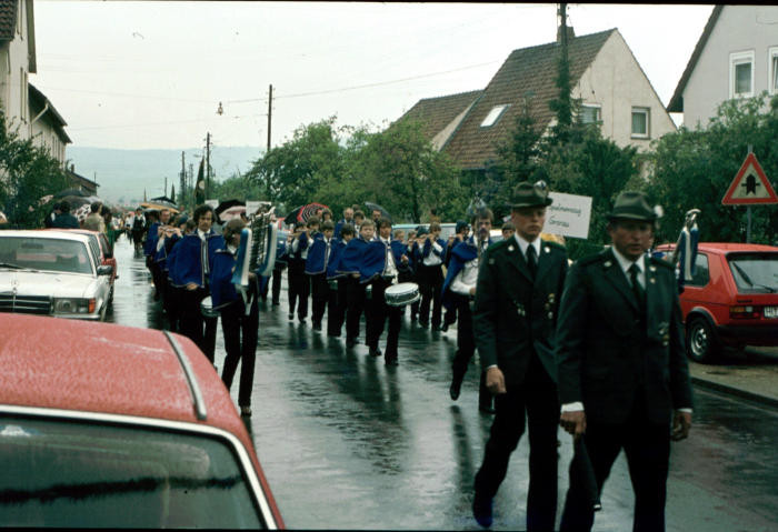 Zuschauer an den Straßenrändern und in den Häusern. Nch einer kurzfristig geänderten etwas kürzeren Strecke ging es mit den vielen auswärtigen Vereinen und Kapellen zum Festzelt, wo die Siegerehrung