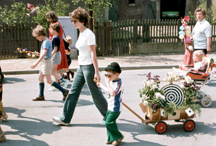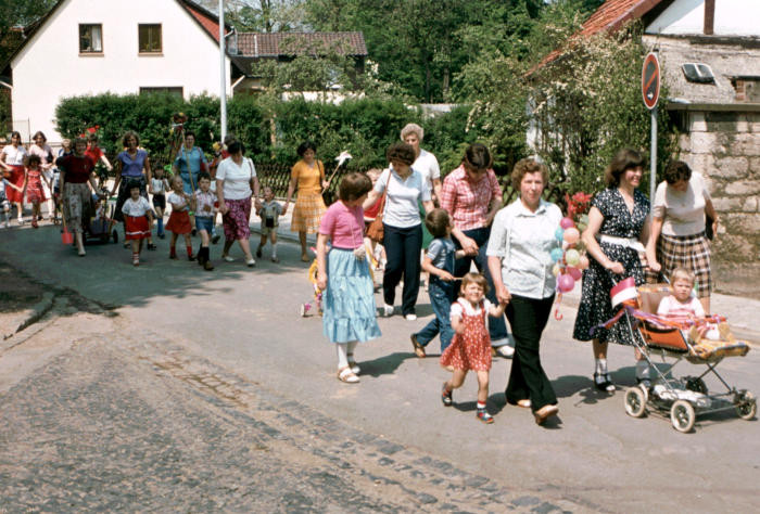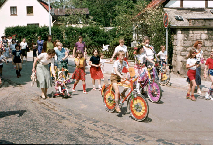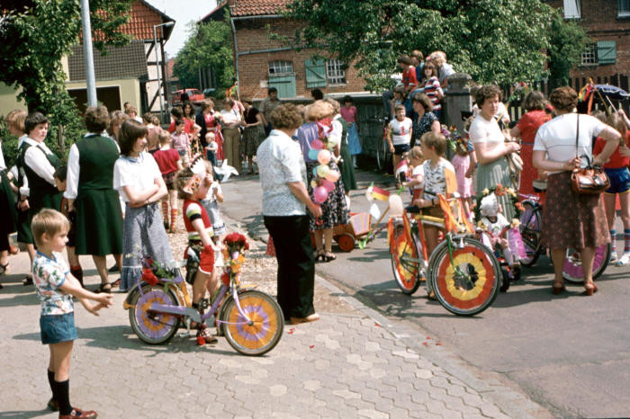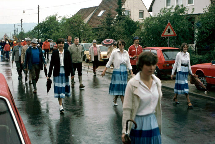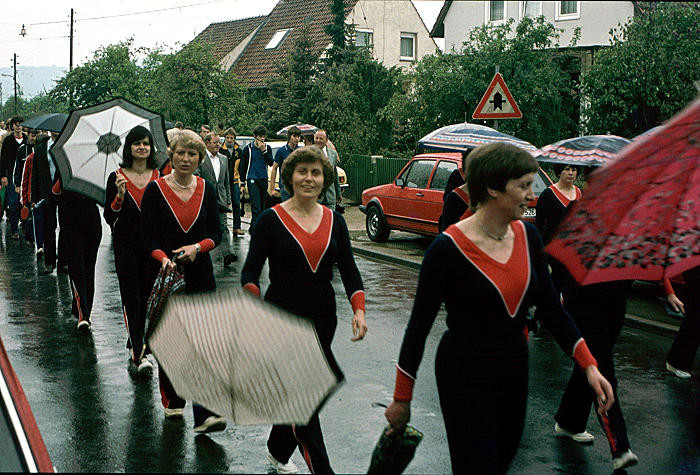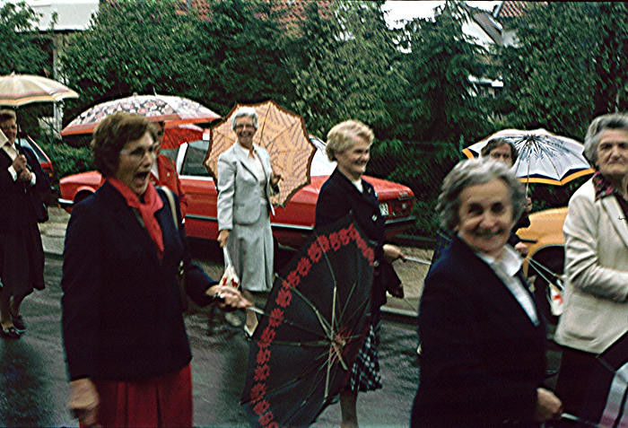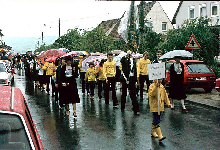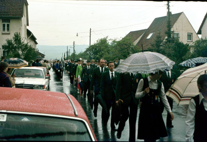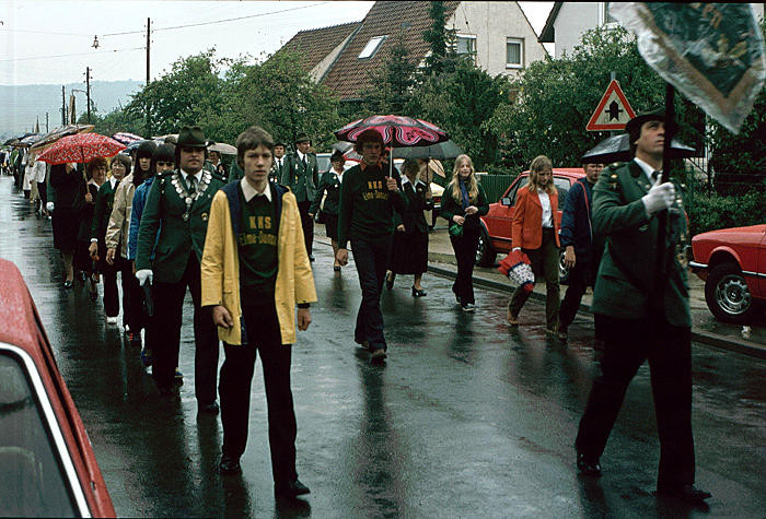 Der schmucke Festumzug um 14 Uhr drohte ins Wasser zu fallen, aber kurz vor Beginn ließ der Regen nach und planmäßig konnte sich der farbenfrohe Zug in Bewegung setzen, sehr zur Freude der vielen