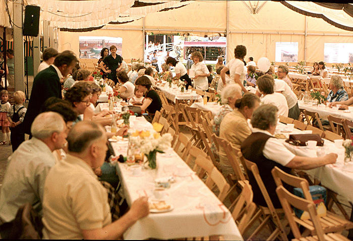 Form von Regentropfen auf das Zelt möge nunmehr im Zelt in Form des Gerstensaftes die durstigen Kehlen zufriedenstellen. Ein farbenprächtiger Blumenstrauß wurde der Festwirtin für die vorzügliche