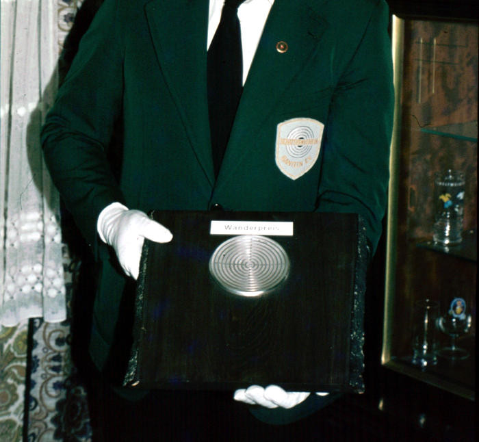 dem Vorsitzenden im Namen des Präsidenten, Dr. Trump, die bronzene Plakette des Niedersächsischen Sportschützenverbandes. An den 25. Geburtstag soll ein Zinnteller erinnern, den Ewald Wienecke im