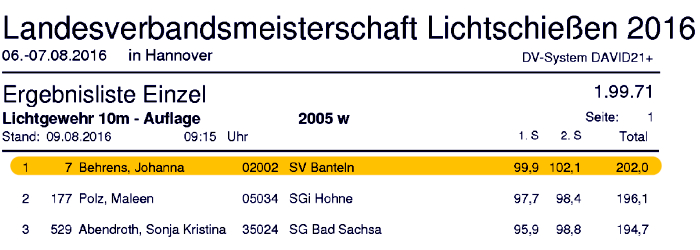 Im Starterfeld von 56 Schützinnen des Jahrgangs 2005 wurde unsere Schützin Johanna Behrens mit einem herausragenden Ergebnis von 202,0 Rg. Landesmeisterin.