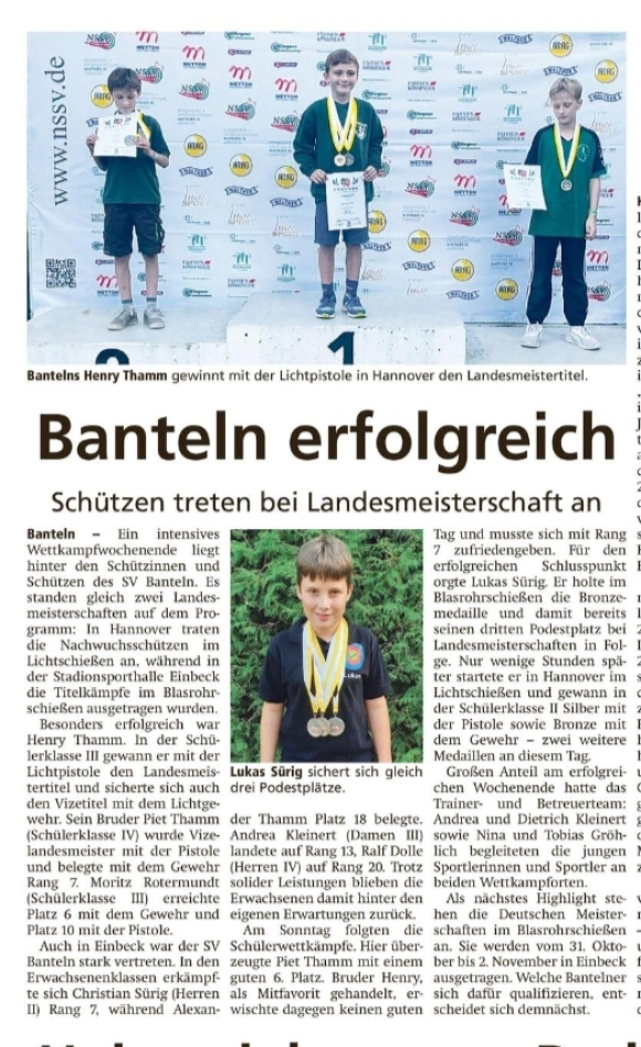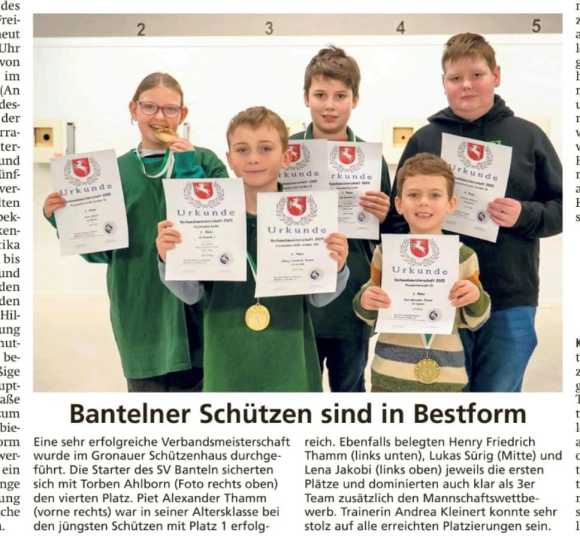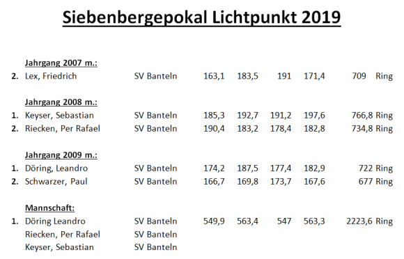 In den Luftdruckdisziplinen wurde mit zum Teil persönlichen Bestleistungen ein herausragendes Ergebnis der Schüler und Jugendlichen des SV Banteln erreicht:
